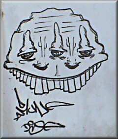 Middle Eastern war. It's a puzzling bit of sadness, the clown-faces, disturbed ghosts, angry Santa's. If one could renounce one's little rented room for a day and journey into the clouds, and look down from the freedom of a bird, what would we see? Remove our bodies from the endless plights of "cops and robbers" for a day, for an instant. Look. See. What do you find? Sad, frightening, empty, angry, lonely, disturbed. The melancholy voices of mankind. A disheveled orchestra, a cacophony of bittersweet tributes to the labyrinth we call "home". This gloomy white monster above is saying "hello", but would you want to enter his friendly house?