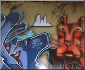 At the Far End of things we have a Calming Pastel Study, foisted on us by "Snak, Smerk, Dinot" and others with less pronouncable handles. Kudos to them all for breaking out of Uncle Sammie's Red, White & Blue testosterone-enriched color wheel. I won't consult our normal Colors'r'Us Oracle, but I will offer that this piece would still the restless mind of anyone taking heavy anti-psychotic medication for extended periods of time. Thank you for that. Thanks to Bill Bake for his informative website outlining some of Vancouver's top crews. Credit for this piece goes to SAL CREW, composed of AKEWS, CINCO, FUNK, MENTOS, SUPER, STEAK, TASQ, TOFU. How about a vegetarian dog biscuit for dessert?